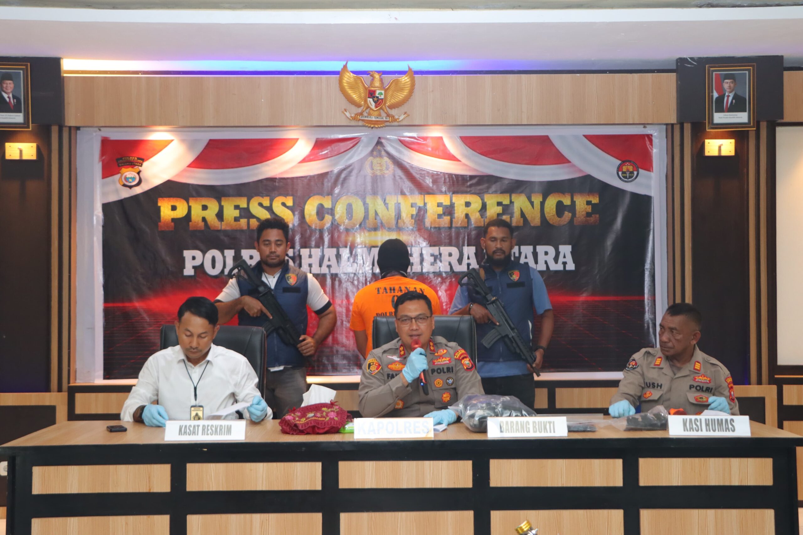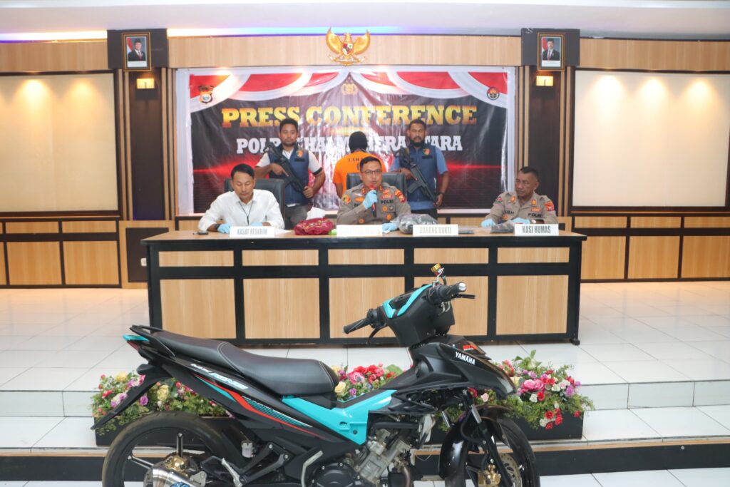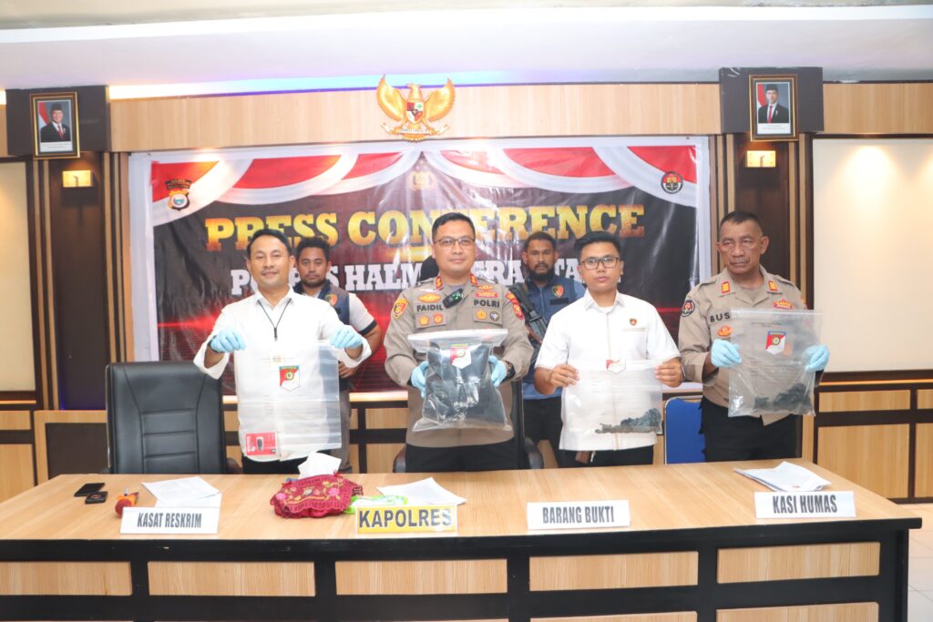 Kapolres Halmahera Utara AKBP Faidil Zikri S.H, S.I.K menggelar Konferensi Pers penangkapan pelaku pelemparan bom molotov di Desa Dokulamo Kecamatan Galela Barat. Press Conference ini dilaksanakan di Aula Amarta Polres Halmahera Utara Maluku Utara, Senin (28/4/25)